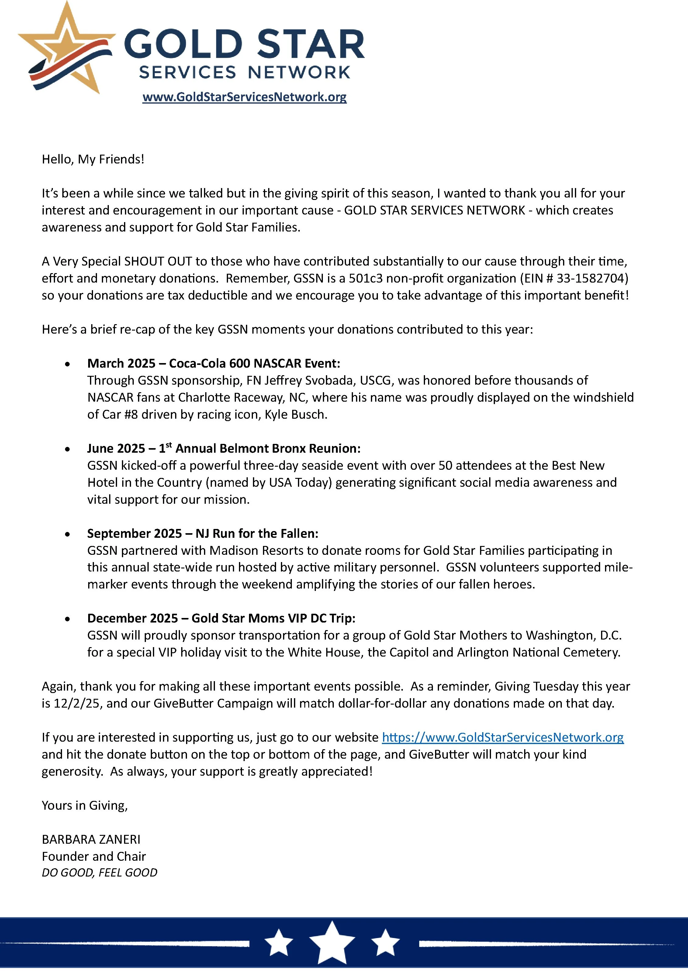 Thank you for helping us honor our fallen heroes. Your support – no matter what the size - truly makes a difference. Giving Tuesday on December 2nd is the perfect time to make an impact by donating at: https://www.goldstarservicesnetwork.org/donate